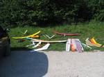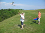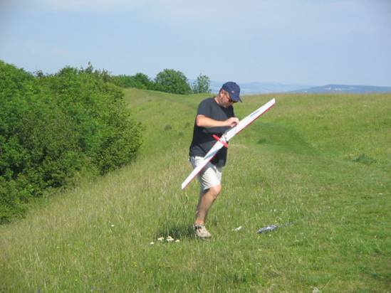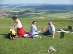 Gegen Mittag erreichten wir den Hesselberg. Nach der Ankunft wurden die Modelle montiert und noch ein paar hundert Meter zur Hangkante getragen. Das Wetter war fantastisch, doch leider kam der Wind relativ ungünstig aus östlicher Richtung - Südwind wäre optimal gewesen. Es waren außer uns natürlich noch ein paar andere Modellflieger da. Diese packten entweder gar nicht aus, oder scheiterten mit ihren Flugversuchen und mussten nach einer Außenlandung weit unten in der Ebene vor dem Hesselberg das Modell wieder zurückholen.